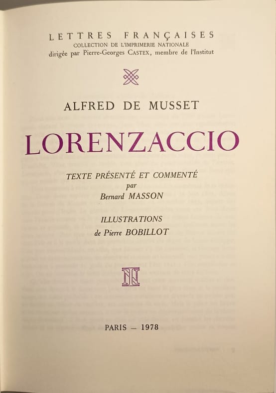 Imprimerie Nationale 1978 369 pages in8. 1978. reliure editeur. 369 pages. Lorenzaccio est un drame romantique en cinq actes écrit par Alfred de Musset en 1834 inspiré d'une idée de George Sand. La pièce raconte l'histoire romancée de la tentative de révolution des Florentins pour renverser le pouvoir des Médicis en 1536-1537 en suivant le personnage tourmenté de Lorenzaccio qui tente de commettre un crime patriotique pour donner un sens à sa vie