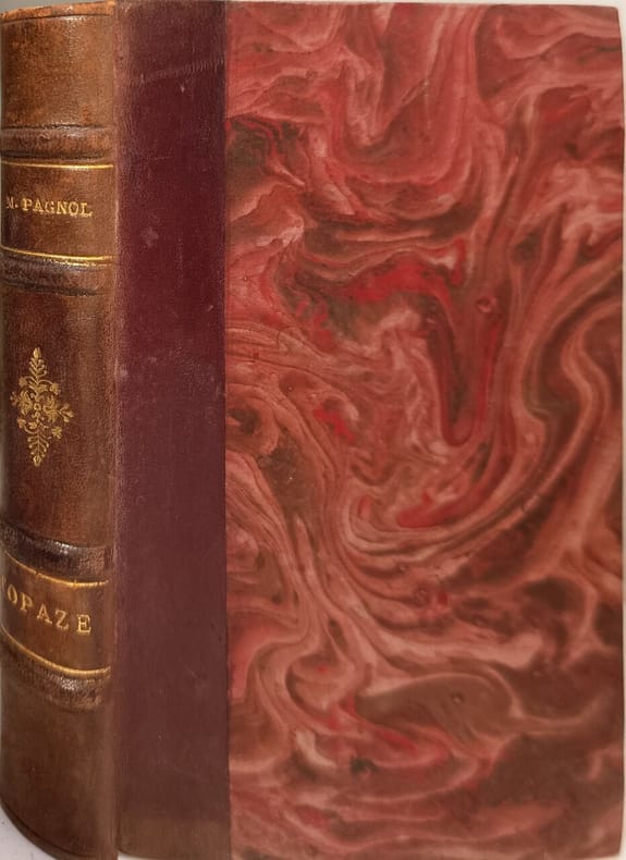 « La collaboration de ces deux grands méridionaux que furent l'écrivain Marcel Pagnol et le dessinateur Albert Dubout est tenue pour capitale pour la compréhension de leur oeuvre respective. Pourtant, elle ne prit effet qu'en 1936, alors que Pagnol écrivait pour le théâtre depuis 1923. Dubout de son côté, âgé de 31 ans, était déjà célèbre. C'est par l'intermédiaire du caricaturiste Toé, directeur de la publicité de la Société des films de l'écrivain, que Dubout fit la connaissance de Pagnol et réalisa la première affiche de César, qui venait d'être porté à l'écran. Dès lors, de Fanny à Manon des Sources, l'artiste réalisa des affiches pour tous les films de Pagnol, qui contribuèrent notamment à l'immense popularité de l'oeuvre du dramaturge. Parallèlement, par leur qualité, les illustrations de Dubout participèrent au succès de librairie des romans de Pagnol (...). Maître du jeu, Dubout laisse libre cours à son imagination débridée, ponctuée de connotations comiques et grivoises. Il affectionne les contrastes les plus étonnants et a parfois recours à des effets de plongée et de contre-plongée, familiers au cinématographe. C'est le cas dans les illustrations de Topaze, par exemple, dans le but de renforcer la puissance économique et politique de certains individus, ou de mettre en évidence le contexte social dans lequel ils évoluent » (Solange Vernois, «Marcel Pagnol et Albert Dubout : la dynamique de la création», in Tierce, Université de Poitiers, n° 2-2017). Après César, Marcel Pagnol confiera en 1948 à Dubout les illustrations de la trilogie Marius, Fanny, César. C'est un énorme succès. Suivra ce Topaze, en 1952, puis la trilogie des Souvenirs d'enfance, entre 1958 et 1965, en ayant donné auparavant nombre d'affiches de ses films : sa célèbre trilogie, La Fille du puisatier, La Femme du boulanger, Topaze, La Gloire de mon père, Le Château de ma mère, Le Temps des secrets, Merlusse, Angèle, Naïs... À l'issue de la parution de la deuxième trilogie, en 1958, Pagnol aura ces mots : « Mon cher Albert, J'admire notre livre. C'est une très belle réussite et je crois que tu es arrivé au sommet de ton talent. Tes couleurs sont aussi belles, aussi originales que ton dessin. Tu es sans aucun doute le plus grand illustrateur de notre temps, et ton trait est incomparable. Une sûreté, une force et une finesse qui font penser aux plus grands asiatiques. [...] Un régal pour l'oeil, Albert tu es le roi. » (Lettre de Pagnol à Dubout, Cagnes, 20 mars 1959). Il est joint un certificat, daté et signé du 23 avril 2021, de Didier Dubout (petit-fils et ayant-droit de son grand-père), certifiant que l'exemplaire faisait bien partie de la bibliothèque personnelle d'Albert Dubout et «qu'il s'agit du seul envoi connu de la famille de Marcel Pagnol à Albert Dubout ». Un second exemplaire sur une oeuvre commune est néanmoins apparu depuis, mis à la connaissance de la famille : la première édition de Marius, illustrée par Dubout à la Libération, en 1945, qui porte cet envoi : «pour mon cher Albert Dubout, avec mon affection et mon admiration, son ami, Marcel Pagnol», Ainsi qu'une édition d'un texte seul, celui de La Gloire de mon père et Le Château de ma mère, avec ces envois : « pour mon cher Albert, avec mon affection, Marcel Pagnol, 1957 » ; « pour Albert Dubout, hommage au travailleur ! Marcel ». On joint un portrait de Dubout par Albert Decossy, dédicacé.
