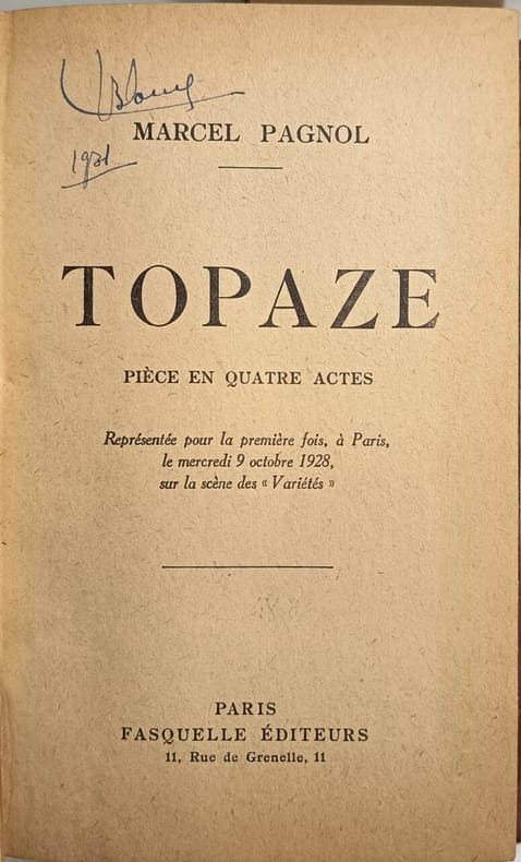 Editions Pastorelly 1973 337 pages in8. 1973. reliure editeur. 337 pages. Topaze est une pièce de théâtre de Marcel Pagnol créée en 1928 qui raconte l'histoire d'un modeste et honnête professeur Albert Topaze. Embauché comme prête-nom par un conseiller municipal véreux il se retrouve plongé dans le monde cynique de la bourgeoisie et de l'argent où il finit par adopter les méthodes de ceux qu'il méprisait initialement. C'est une comédie satirique sur la corruption et la puissance de l'argent