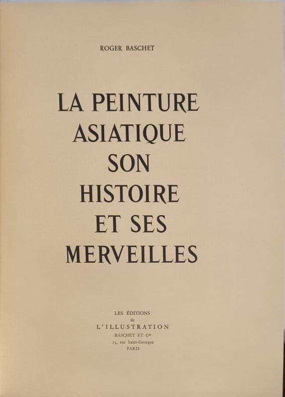 Les Éditions de l'Illustration Baschet et Cie 1954 110 pages infolio. 1954. reliure editeur broché couverture rempliée. 110 pages. Ouvrage de synthèse de Roger Baschet consacré à l'histoire et aux chefs-d'œuvre de la peinture asiatique publié en 1954. Il retrace l'évolution les écoles et les grands maîtres des traditions picturales de Chine du Japon et d'Asie du Sud-Est et est richement illustré de reproductions en couleur