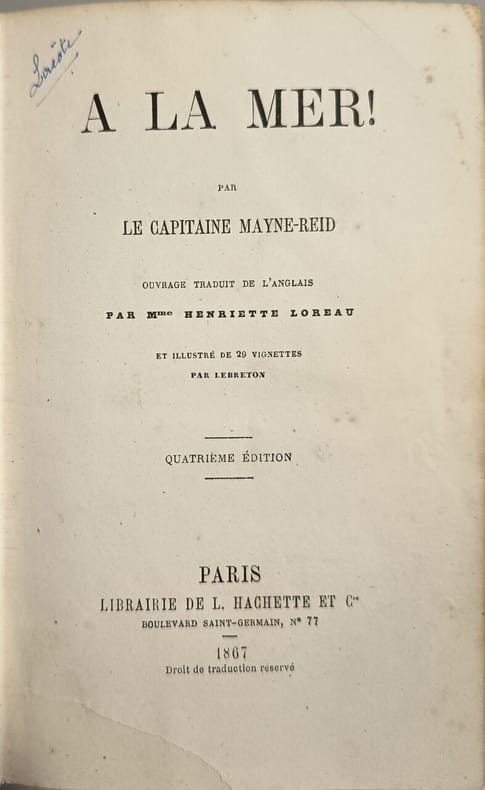 Librairie de L. Hachette et Cie 1867 390 pages in8. 1867. reliure editeur. 390 pages. Roman d'aventures maritimes du Capitaine Mayne-Reid traduit de l'anglais par Mme Henriette Loreau publié par Hachette & Cie dans une édition illustrée de gravures en noir et blanc. L'extrait présente une scène où le capitaine et des matelots réagissent par des éclats de rire avant de retourner se coucher