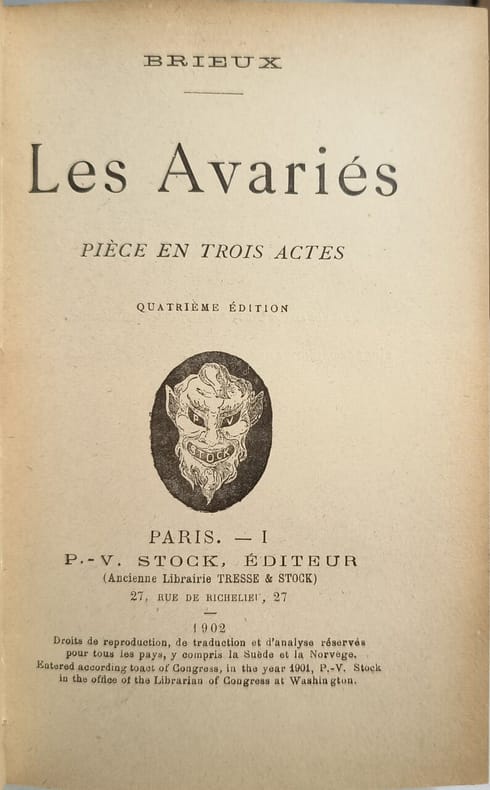 P.-V. Stock Éditeur 1902 228 pages in8. 1902. reliure éditeur demi basane dos à nerfs. 228 pages. Pièce de théâtre en trois actes d'Eugène Brieux qui dénonce l'indifférence de la société et du monde politique face aux maladies comme la syphilis l'alcoolisme et la tuberculose. La pièce répétée en 1901 a été interdite par la censure avant d'être créée à Liège en 1902