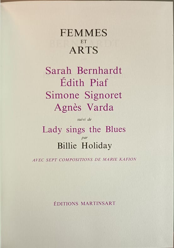 ÉDITIONS MARTINSART 1980 374 pages in4. 1980. plein skyvertex. 374 pages. Ouvrage collectif de la collection 'Femmes et Société' consacré à plusieurs figures féminines majeures des arts dont Sarah Bernhardt Édith Piaf Simone Signoret et Agnès Varda. Il s'agit d'un livre d'art richement illustré avec des photographies et des compositions originales offrant un panorama de l'apport de ces artistes à la culture