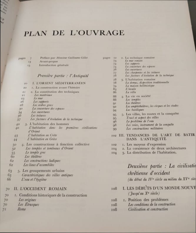 1970 Paris, Editions du moniteur des travaux publics, 1970. in-4 reliure pleine toile rouge éditeur, jacquette illustrée, 579 pp. Préface de Guillaume Gillet. Richement illustré en photos et croquis n&b, intercaleurs papier de couleur argentée. Glossaire se rapportant à l'art de bâtir et les termes se rapportant à des notions historiques. Parfait état.