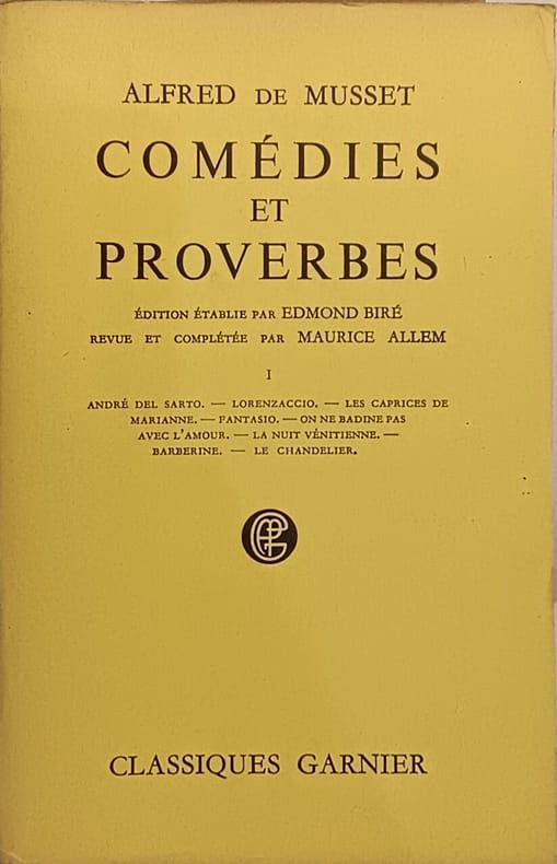 Classiques Garnier 1960 495 pages in8. 1960. broché. 495 pages. Comédies et Proverbes est un recueil des principales pièces de théâtre d'Alfred de Musset publiées entre 1832 et 1851 incluant des œuvres majeures comme 'Les Caprices de Marianne' 'Fantasio' 'On ne badine pas avec l'amour' 'Lorenzaccio' 'Le Chandelier' et 'Il ne faut jurer de rien'. L'édition analysée est une édition patrimoniale des Classiques Garnier établie par Edmond Biré qui propose des notes critiques et respecte une politique de conservation du texte original