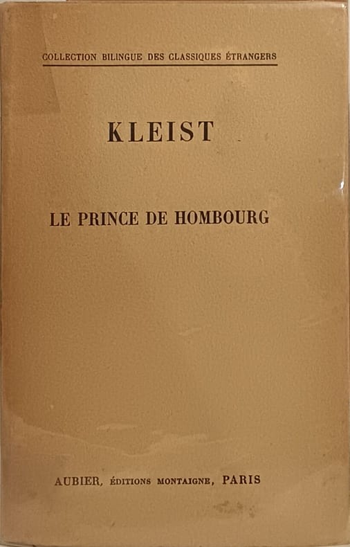 Aubier Éditions Montaigne 1951 109 pages in8. 1951. broché. 109 pages. Le Prince de Hombourg dernière œuvre de Heinrich von Kleist est un drame héroïco-romantique. Le prince commandant de cavalerie remporte une bataille contre les Suédois en désobéissant aux ordres de l'Électeur ce qui lui vaut une condamnation à mort par cour martiale. L'intrigue explore son dilemme moral et les tentatives de sa fiancée pour le sauver dans une atmosphère où rêve et réalité s'entremêlent