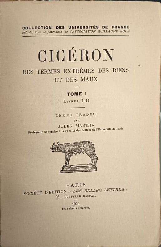 Les Belles Lettres 1929 119 pages in8. 1929. broché. 119 pages. Cette édition critique par Jules Martha présente la traduction et l'établissement du texte de Cicéron 'Des termes extrêmes des biens et des maux' un traité philosophique qui examine la question du souverain bien et du souverain mal selon les différentes écoles philosophiques grecques cherchant à déterminer ce qui peut assurer à l'homme une vie pleinement heureuse