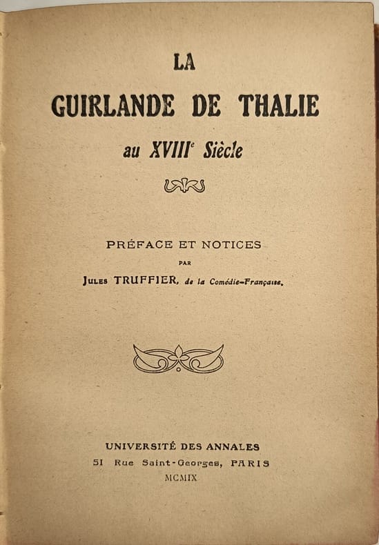 Université des Annales 1909 183 pages in12. 1909. reliure éditeur demi toile à coins. 183 pages. Il s'agit d'une anthologie critique publiée en 1909 consacrée au théâtre français du XVIIIe siècle. L'ouvrage édité par Jules Truffier comprend une préface et des notices présentant une sélection d'extraits de pièces de grands auteurs dramatiques de l'époque comme Regnard Voltaire Le Sage ou Piron