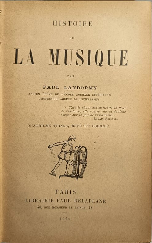 Librairie Paul Delaplane 1914 358 pages in12. 1914. reliure editeur pleine toile. 358 pages. Ouvrage de référence de Paul Landormy historien et critique musical retraçant l'histoire de la musique. L'édition analysée est publiée par la Librairie Paul Delaplane avec plusieurs éditions révisées et augmentées entre 1910 et les années 1920. Le livre aborde notamment les origines comme la musique grecque et ses liens avec la poésie et adopte une approche érudite nécessitant selon une critique de l'époque des 'connaissances très étendues' et des 'qualités particulières d'exposition'