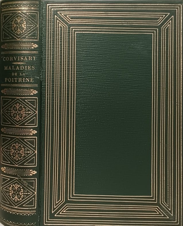 Paris, Migneret, 1808, in-8, XXIII-[1]-440 pp, [1] ff. d'errata, Basane racinée de l'époque, dos lisse et fleuronné, pièce de titre rouge, tranches rouges, Édition originale de la traduction par Jean-Nicolas Corvisart (1755-1821) du texte latin d'Auenbrugger (1722-1809), Inventum novum ex percussione thoracis humani (Vienne, 1761). Cet ouvrage, dans lequel le médecin viennois présentait la technique de la percussion pour le diagnostic des maladies internes, fut traduit en français pour la première fois en 1770 par Rozière de La Chassagne. Mais Corvisart en donne ici une toute autre version, largement annotée et modifiée, si bien qu'on reconnaît difficilement le texte original. Corvisart pratiqua la percussion pendant plusieurs années dans son propre travail clinique ; il était si convaincu de son efficacité qu'il prépara cette édition de l'Inventum novum, qui finit par convaincre la communauté médicale de la valeur de la découverte d'Avenbrugger (Norman). Le travail de Corvisart prépara la voie à Laënnec. Exemplaire bien complet du feuillet d'errata. Annotations anciennes manuscrites à l'encre brune sur la table des matières. Frottements, un coin anciennement restauré. Garisson & Morton, n°2672. Norman n °83. Waller n° 526. Wellcome II, p. 395. Couverture rigide