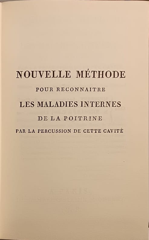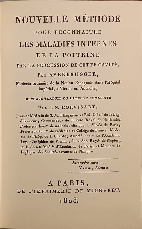 Éd. orig. de l'importante traduction par Corvisart (1755-1821), de ce texte de Leopold Avenbrugger (1722-1809), qui a paru pour la 1re fois à Vienne en latin en 1761. L'ouvrage fut traduit en français pour la 1re fois en 1770 par Rozière de La Chassagne. Corvisart qui pratiqua longtemps la technique de la percussion, apporta les résultats de sa propre expérience, et enrichit considérablement le texte. Il en donne ici une toute nouvelle version, largement annotée et modifiée ; il réécrit l'ouvrage en quelque sorte. Corvisart joua un rôle essentiel, popularisa la technique de la percussion dans l'examen clinique, en l'enseignant à ses élèves, ce qui prépara la voie à Laënnec.