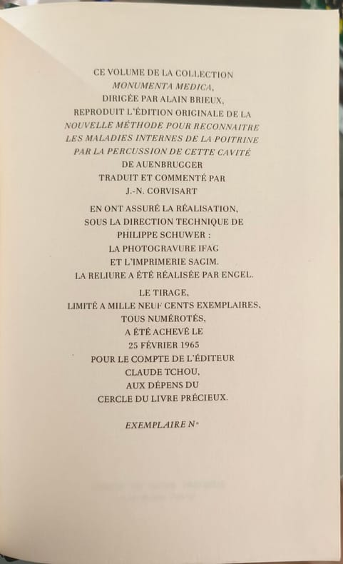 Cercle du livre précieux Paris 1965 440 pages in8. 1965. reliure editeur. 440 pages. Ouvrage médical fondateur de Leopold Auenbrugger présentant la technique de la percussion thoracique pour le diagnostic des maladies internes de la poitrine. L'édition analysée est la traduction française commentée par Jean-Nicolas Corvisart qui a joué un rôle essentiel dans la popularisation de cette méthode clinique