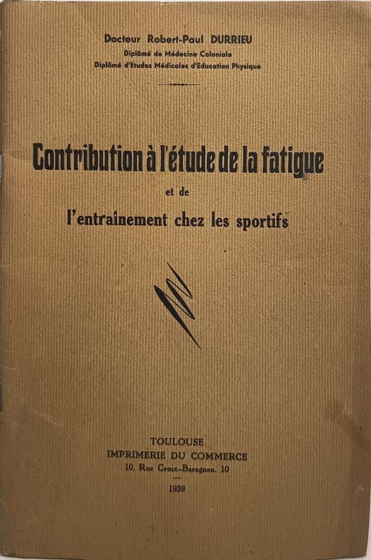 Imprimerie du Commerce 1939 60 pages in8. 1939. agrafé. 60 pages. Ouvrage scientifique de 1939 du Dr Robert Paul Durrieu qui étudie la fatigue et les méthodes d'entraînement chez les sportifs abordant notamment l'entraînement respiratoire pour lutter contre l'essoufflement. Ce livre de 60 pages représente une contribution historique à la médecine sportive