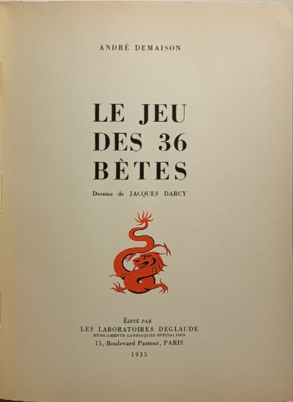 Les Laboratoires Deglaude 1935 87 pages in8. 1935. Broché couverture rempliée. 87 pages. Ouvrage publié en 1935 par les Laboratoires Deglaude réservé exclusivement aux médecins qui présente 36 animaux à travers des textes d'André Demaison et des illustrations en couleurs de Jacques Darcy. Ce livre hors-commerce sert également de catalogue commercial pour les produits pharmaceutiques de l'éditeur