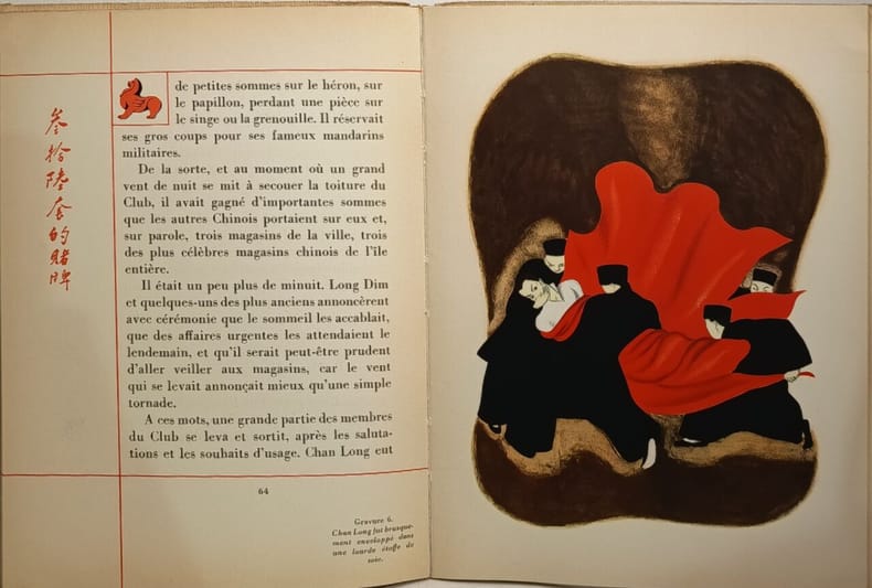 EDITION ORIGINALE. Tirage ordinaire après 5 japon et 15 hollande. Vign. de titre, 2 vign. dans le texte en deux tons (noir et rouge) et 8 pl. h.t. en couleur de Jacques DARCY. Texte imprimé dans un encadrement de filet rouge, bordé de calligraphie en noir ou rouge, et orné de motifs animaliers orientaux. Edition réalisée pour les Laboratoires Deglaude par les presses de Draeger Frères. "uvrage Hors-Commerce - Réservé exclusivement à nMM. les Médecins". Bords de couv. infimement insolés, petite déchirure à la page de garde, sinon, bel exemplaire.