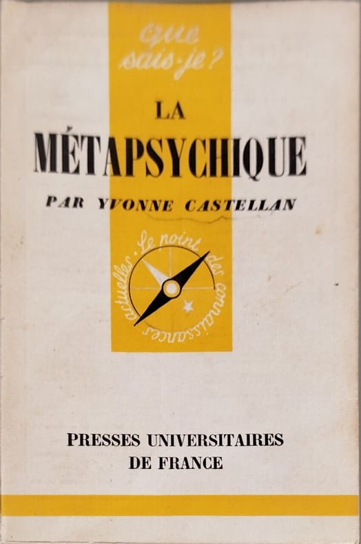 Presses Universitaires de France 1955 collection que sais je n° 671. poche. 1955. broché. Cet ouvrage le numéro 671 de la collection Que sais-je ? est une introduction à la métapsychique (étude des phénomènes paranormaux) écrite par Yvonne Castellan et publiée aux Presses Universitaires de France. Il s'agit d'une réédition numérique d'un livre paru au XXe siècle initialement publié en 1955 et réédité en 1966 qui présente le sujet de manière accessible au grand public