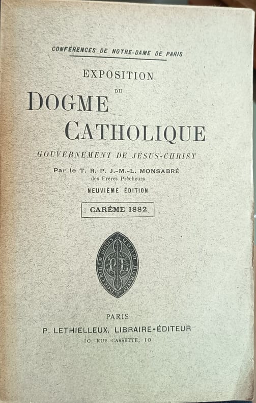 P. Lethielleux Libraire-Éditeur 1882 423 pages in8. 1882. broché. 423 pages. L'Exposition du dogme catholique est une œuvre magistrale en 20 volumes du Père Jacques Marie Louis Monsabré dominicain et docteur en théologie. Rédigée entre 1873 et 1890 elle rassemble les conférences prononcées à Notre-Dame de Paris et vise à exposer de manière rigoureuse et accessible l'ensemble du dogme catholique abordant notamment l'autorité de l'Église l'existence de Dieu et la vie de Jésus-Christ