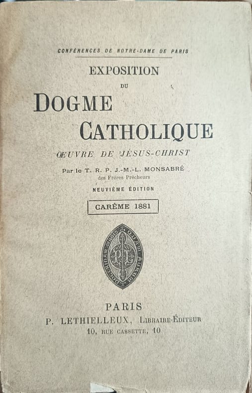 P. Lethielleux Libraire-Éditeur 1881 305 pages in8. 1881. broché. 305 pages. L'Exposition du dogme catholique du Père Monsabré est une œuvre magistrale en plusieurs volumes constituée des conférences de Carême prononcées à Notre-Dame de Paris entre 1872 et 1890. Elle vise à exposer de manière rigoureuse et accessible l'ensemble du dogme catholique avec un volume spécifique consacré à l'œuvre et à la vie de Jésus-Christ