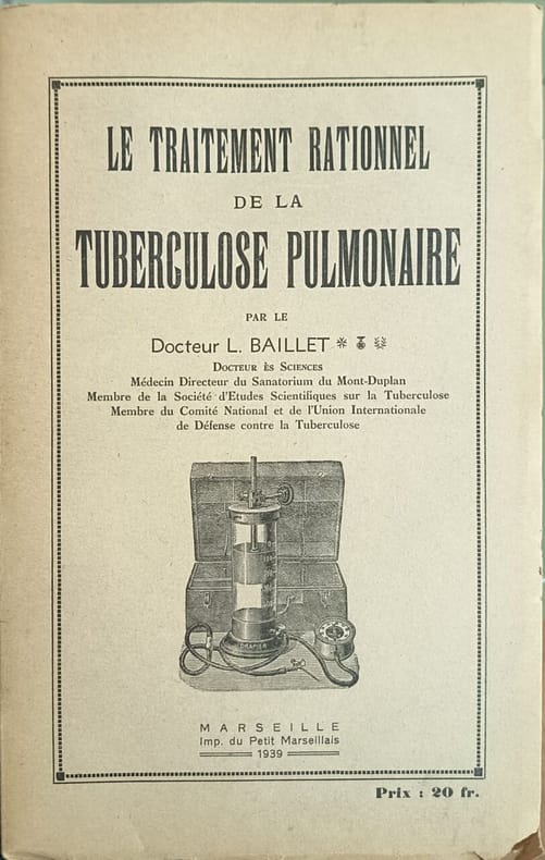 Imp. du Petit Marseillais 1939 169 pages in8. 1939. broché. 169 pages. Ouvrage médical de 1939 du Dr L. Baillet publié à Marseille consacré au traitement rationnel de la tuberculose pulmonaire reflétant les connaissances et pratiques thérapeutiques de l'époque