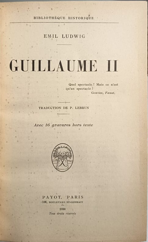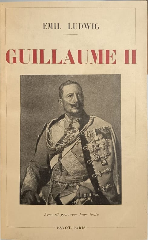 Payot 1930 445 pages in8. 1930. reliure éditeur demi basane dos à nerfs. 445 pages. Biographie de Guillaume II empereur allemand écrite par Emil Ludwig auteur connu pour ses portraits psychologiques approfondis des figures historiques. Le livre explore le caractère complexe et les intérêts multiples de Guillaume II notamment pour les sciences les techniques la religion et l'histoire