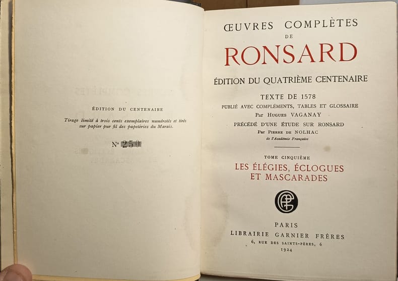 Librairie Garnier Frères 1924 418 pages in8. 1924. reliure demi basane à coins dos à nerfs. 418 pages. Ce tome V des Œuvres complètes de Pierre de Ronsard publié par la Librairie Garnier Frères en 1923 rassemble spécifiquement ses élégies éclogues et mascarades. Il s'agit d'une édition de référence faisant partie d'une collection complète des œuvres du poète de la Pléiade