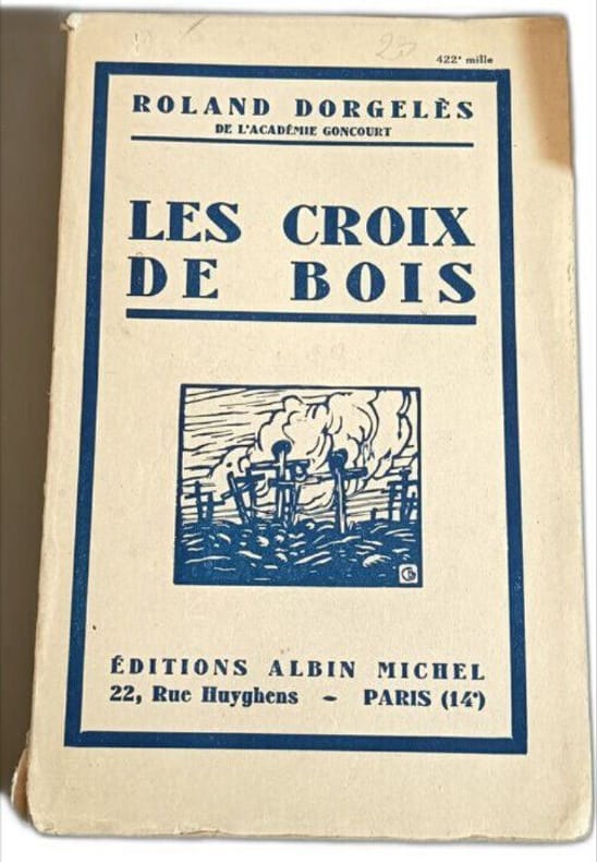 avec un portrait à l'eau forte par G.Gorvel d'après le tableau d’Émile Charmy Édition numéro 1116 sur papier du Marais Les Croix de bois est un roman publié par Roland Dorgelès en 1919 aux Éditions Albin Michel, inspiré de l'expérience vécue par son auteur durant la Première Guerre mondiale, et raconte le quotidien des soldats de l'armée française durant la Première Guerre mondiale. Le long des chemins du front, on trouvait souvent une ligne à perte de vue de croix de bois, faites à la va-vite, et posées au-dessus des cadavres de soldats allemands ou français. Soldats inconnus, jeunes soldats, c’est en leur hommage que Dorgelès écrit ce livre, c’est pour leur souvenir, leur mémoire. vol. relié jolie reliure, 23x15, très bel exemplaire, tranche de tête dorée, 225pp + catalogue, cachet du relieur Maertens, Couvertures d'origines conservées avec dos Édition G. Crès & Cie, 1923 ref/50