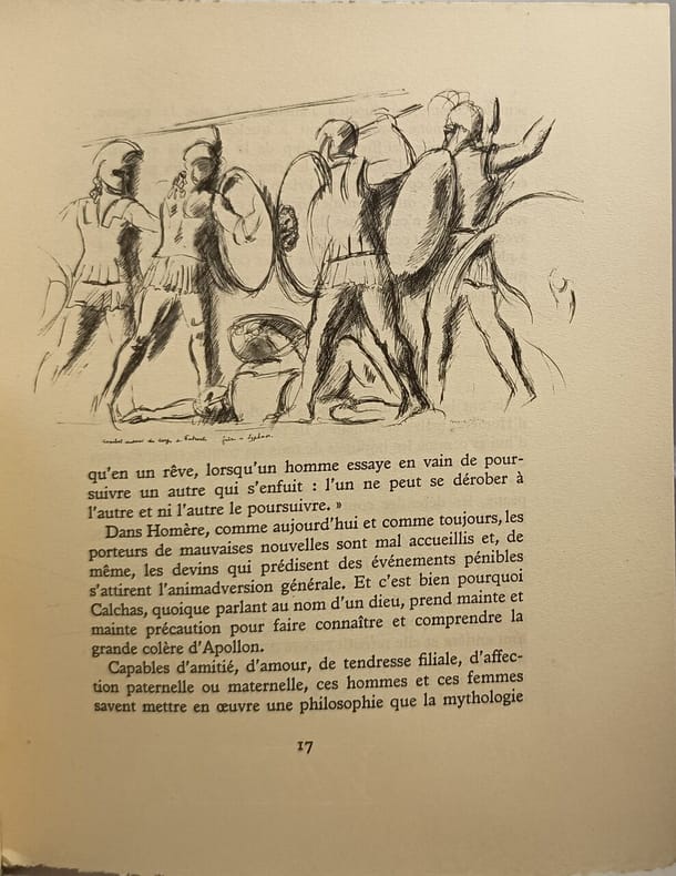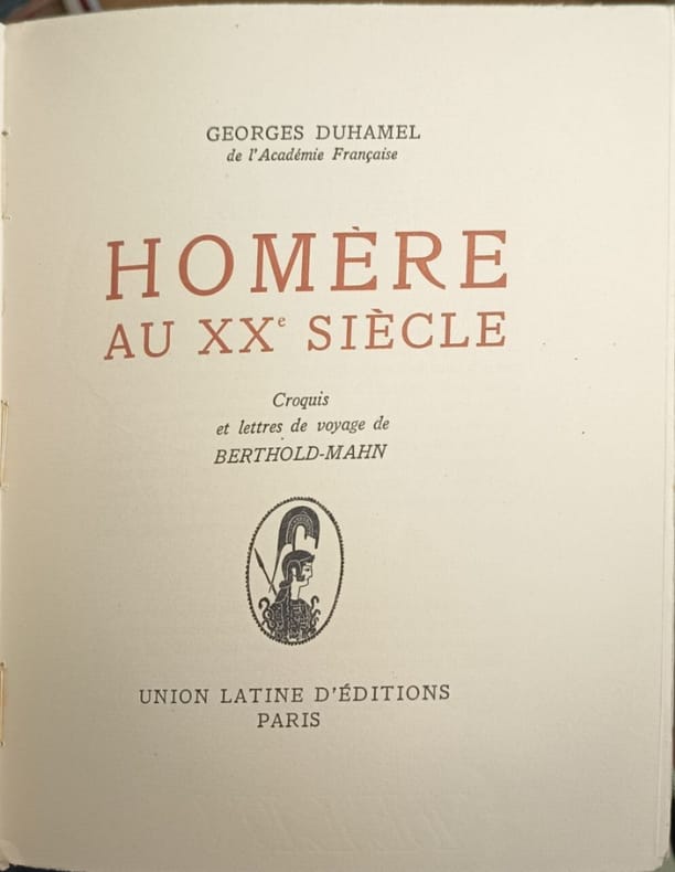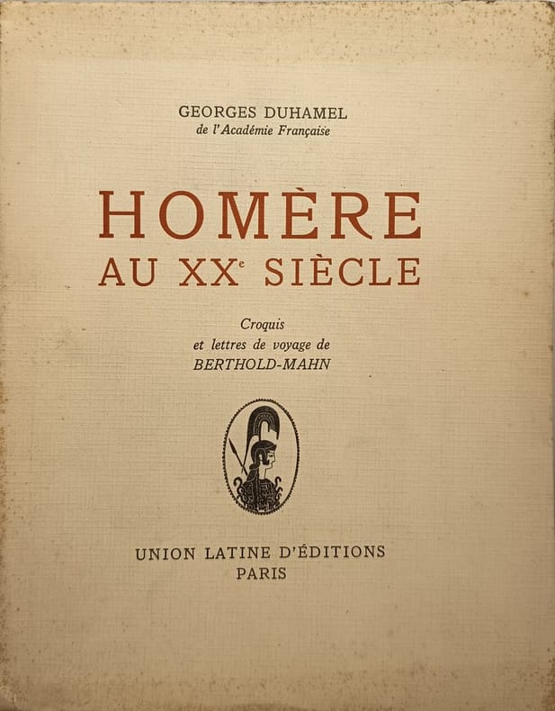 Union Latine d'Éditions 1947 123 pages in8. 1947. broché. première édition. 123 pages. Essai de Georges Duhamel qui interroge l'actualité et la pertinence des œuvres d'Homère (l'Iliade et l'Odyssée) au XXe siècle plus de deux millénaires après leur création. L'ouvrage est accompagné de croquis et de lettres de voyage de Berthold-Mahn réalisés lors d'un séjour en Grèce en 1936
