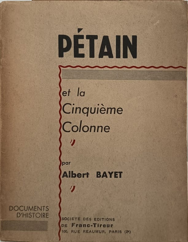 Société des Editions de Franc-Tireur 1944 98 pages in12. 1944. broché. 98 pages. Ouvrage publié en 1944 par Albert Bayet intellectuel résistant qui analyse le rôle du maréchal Pétain et dénonce son régime comme une 'cinquième colonne' au service de l'occupant nazi. Ce pamphlet s'inscrit dans la littérature de la Résistance française pendant la Seconde Guerre mondiale