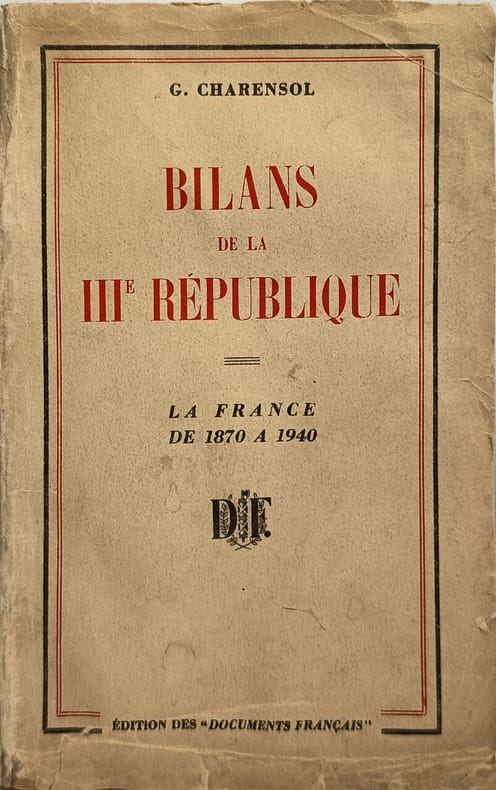 Documents Français 1942 255 pages in8. 1942. broché. 255 pages. Ouvrage historique de G. Charensol publié en 1942 qui dresse un bilan de la Troisième République française couvrant la période allant de sa proclamation le 4 septembre 1870 à sa fin le 10 juillet 1940. Le livre analyse l'évolution de la France sur ces sept décennies