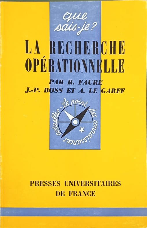 nombreuses figures et schémas 1ere édition Contents, Chapitres : Preface de P. Guérin - Introduction à la recherche opérationnelle - 1. La recherche opérationnelle contre le hasard : Les phénomènes d'attente - Problèmes de stock, usure et renouvellement des équipements - Méthodes de simulation - 2. La recherche opérationnelle, fil conducteur dans les problèmes combinatoires : Eléments d'algèbre de Boole et de théorie des graphes - La programmation linéaire, les programmes de transport, éléments de programmation dynamique - 3. La recherche opérationnelle et les problèmes de concurrence : Introduction à la théorie des jeux, notions sur les jeux d'entreprises - Exercices et problèmes - 5. Exemples de programmes : Phénomènes d'attente - Programme linéaire PFI - Gestion des stocks, mise en oeuvre d'une simulation - Théorie des graphes, méthode de description d'un graphe en machine - Exemples divers - Bibliographie sommaire couverture tres legerement jaunie, sinon tres bon etat - on joint la notice nécrologique de Robert Faure, 1919-1982