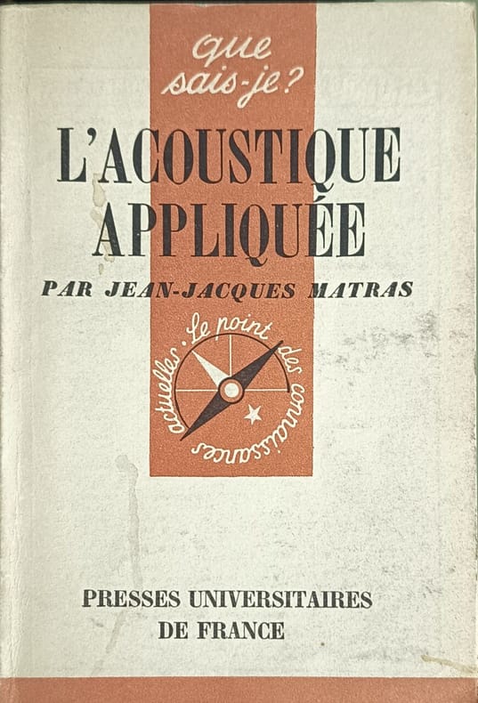 67 figures et schémas dans le texte en noir et blanc 1st edition, 1962 Contents, Chapitres : Avant-propos, préface, table, xx, Texte, 286 pages - 1. Notions préliminaires d'acoustique : Le mouvement périodique - Le phénomène sonore - La mesure du son - Les sources sonores - 2. Isolation phonique des batiments : Données générales - Modes de transmission des bruits - Bruits aériens - Oscillations périodiques audibles - Pratique de l'isolation, recommandations générales - Ebranlements périodiques audibles - Matériaux et dispositifs isolants phoniques - 3. Sonorisation des salles d'audition : La musique et l'acoustique - Le problème de la sonorisation - Les auditoires - Le plein air - Cinémas et studios - Annexes cartonnage propre et solide, sans jaquette papier, intérieur frais et propre, coin inférieur droit des pages à peine corné par endroit, cela reste un bel exemplaire, bien complet du feuillet d'errata