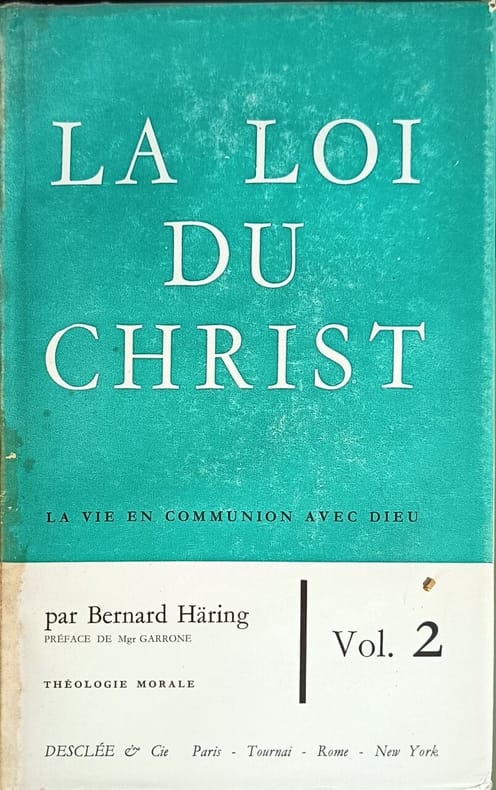 DESCLÉE & Cie 1956 648-388 pages in8. 1956. Broché couverture rempliée. 2 volume(s). 648-388 pages. La Loi du Christ est un traité majeur de théologie morale catholique en trois volumes écrit par le père rédemptoriste Bernard Häring. Destiné aux prêtres et aux laïcs il aborde la théologie morale générale la vie en communion avec Dieu et la vie en communion fraternelle centrant sa réflexion sur l'imitation du Christ et la charité