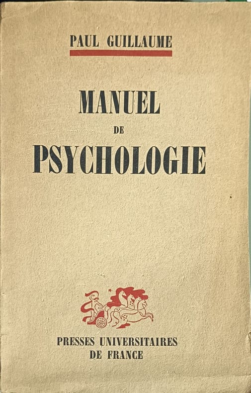 ---- "Les recherches de P. GUILLAUME, 1878/1962, psychologue français, professeur de psychologie et de pédagogie à la Sorbonne, ont surtout porté sur la psychologie animale et la psychologie de l'enfant. C'est lui qui fit connaître la Gestalttheorie en France". (Dictionnaire des philosophes I) ---- Objet et méthodes de la psychologie - Physiologie et psychologie - Les instincts, les tendances, le plaisir et la peine, les émotions, les perceptions, la perception de l'espace, la perception des émotions, la mémoire, l'imagination, les lois de l'association, les niveaux de l'activité mentale, la volonté, la pensée et le langage, la croyance et le raisonnement, l'intelligence, la conscience et ses limites - etc**2491/F5DE