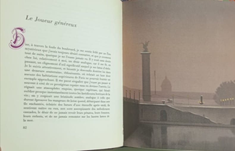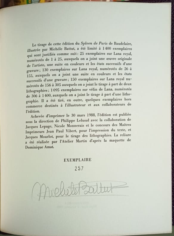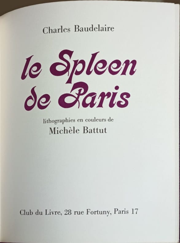 Club du livre 1988 181 pages IN4. 1988. reliure editeur. 181 pages. Il s'agit d'une édition de luxe et limitée (tirage de 1400 exemplaires numéroté 257) du recueil posthume de poèmes en prose de Charles Baudelaire "Le Spleen de Paris" publiée par le Club du Livre en 1988. Cette édition est illustrée de 16 lithographies originales en couleurs de l'artiste Michèle Battut et se distingue par sa reliure d'éditeur en maroquin violet ornée de motifs