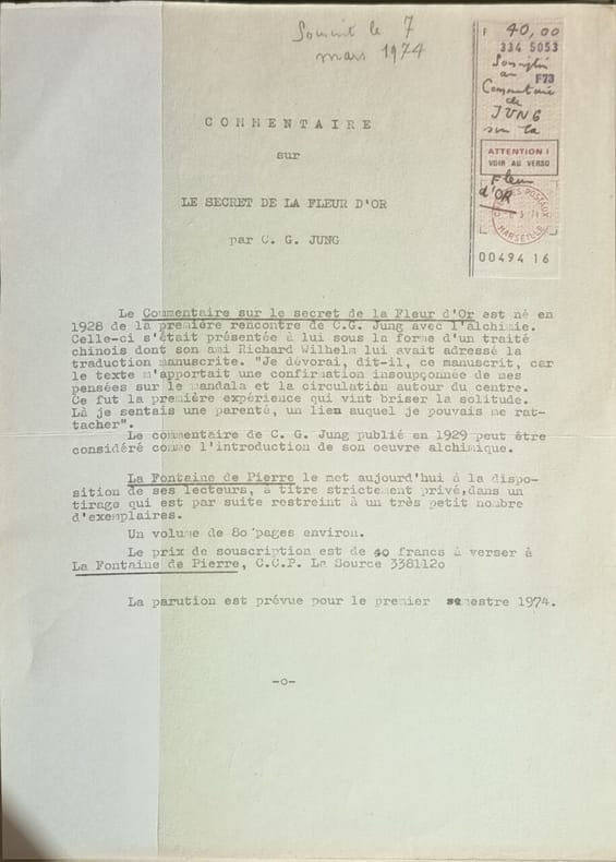 Chez l'auteur 1974 95 pages IN4. 1974. broché. 95 pages. Carl Gustav Jung propose un commentaire approfondi du traité alchimique taoïste chinois 'Le Mystère de la Fleur d'Or' qu'il a découvert via le missionnaire Richard Wilhelm. Cet ouvrage marque une étape cruciale dans son œuvre inaugurant ses recherches sur les spiritualités orientales et explorant des concepts comme la synchronicité la quête de la conscience totale et le processus d'individuation tout en établissant des ponts entre psychologie des profondeurs et traditions asiatiques