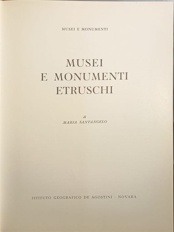 Istituto Geografico De Agostini 1960 168 pages IN4. 1960. Reliure Editeur avec jaquette. 168 pages. Ce livre de Maria Santangelo publié en 1960 par l'Istituto Geografico De Agostini est un guide illustré appartenant à la collection 'Musei e Monumenti d'Italia'. Il présente les musées et monuments de la civilisation étrusque avec de nombreuses illustrations en noir et blanc et en couleur sur 168 pages. L'ouvrage aborde également les origines orientales de cette civilisation