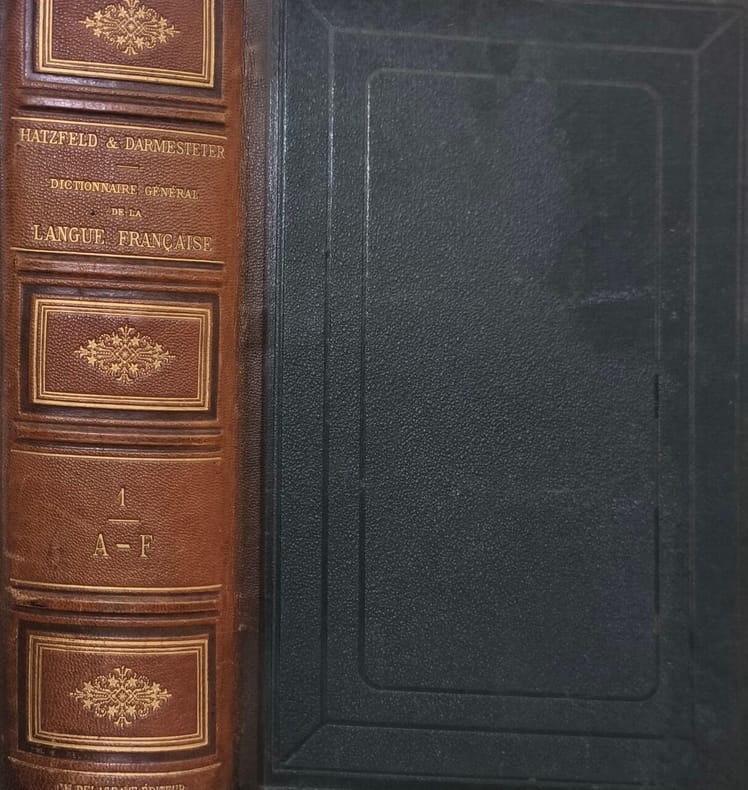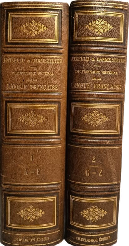 Librairie Ch. Delagrave IN4. Sans date. reliure éditeur demi chagrin dos à nerfs. 2 volume(s). Dictionnaire historique et général de la langue française couvrant son évolution depuis le début du XVIIe siècle. Il vise non seulement à définir les mots et leurs usages mais aussi à expliquer leur origine et leur emploi précédé d'un traité sur la formation de la langue