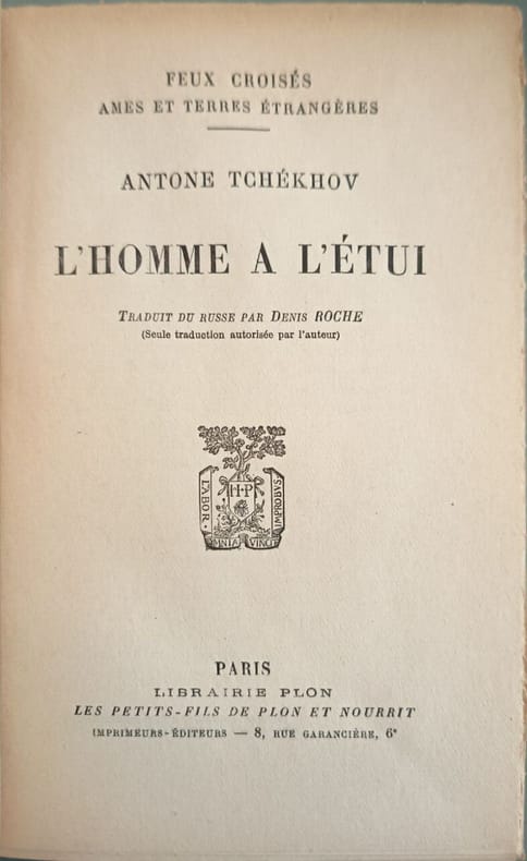 Librairie Plon 1929 304 pages in8. 1929. broché. 304 pages. Cette nouvelle d'Anton Tchekhov raconte l'histoire de Belikov un professeur de grec qui vit dans une peur maladive du monde extérieur. Il s'enferme littéralement et métaphoriquement dans des 'étuis' (vêtements accessoires règles strictes) imposant sa vision conservatrice et étouffante à son entourage jusqu'à une fin tragique