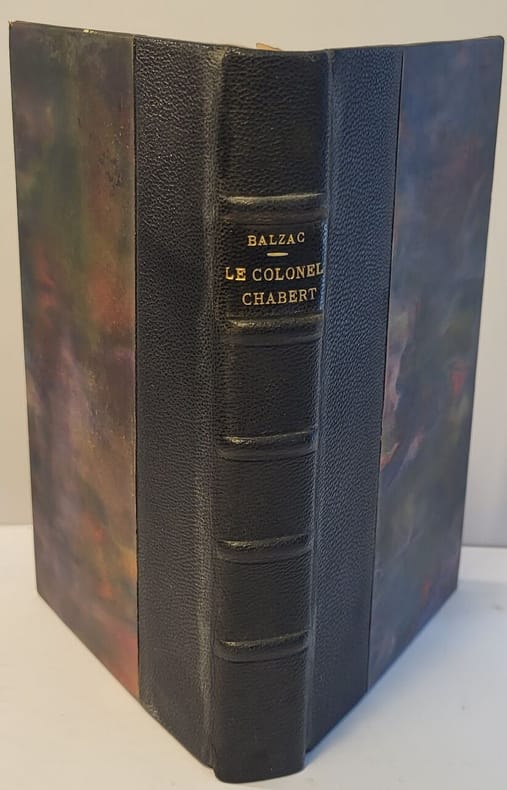Une curieuse plaque tourbillonnante. Un des 500 exemplaire du tirage courant sur vélin blanc (n° 85), après 50 sur Japon avec une suite des illustrations sur Japon en bistre, pour un tirage total de 550 exemplaires numérotés. La plaque qui décore les plats présente dans sa partie centrale un curieux jeu de cercles concentriques à fins sillons, donnant un effet tourbillonnant singulier. La reliure éditeur décrite par Sanjuan (planche LXXXIII) comporte un motif floral octogonal. L'ouvrage est illustré de 40 dessins coloriés au pochoir (dont 6 hors-texte) par André Mare (Argentan : 1885-Paris : 1932), artiste fondateur de l'Art déco. En 1912, il propose La maison cubiste, projet d'architecture jugé scandaleux, qui fait de lui un décorateur de renom. Néanmoins, à partir de 1927 et jusqu'à la fin de sa vie, il se consacre exclusivement à la peinture. Le Colonel Chabert s'insère dans les Scènes de la vie privée de la Comédie humaine. Hyacinthe Chabert, colonel de Napoléon, censé être mort à la bataille d'Eylau en 1807, revient, dix ans plus tard, demander son héritage à son épouse remariée. Monod 775 ; Sanjuan 110. Dos très légèrement insolé et une tache au dos