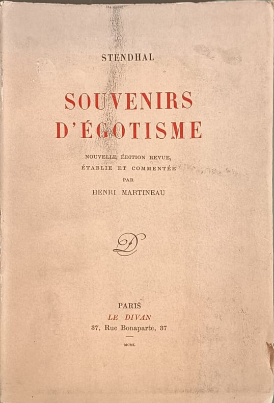 Le Divan 1950 246 pages in8. 1950. broché. 246 pages. Les 'Souvenirs d'égotisme' de Stendhal (Henri Beyle) sont une œuvre autobiographique inachevée rédigée rapidement en 1832 et publiée à titre posthume en 1892. L'auteur y relate minutieusement sa vie à Paris entre 1821 et 1830 après la chute de Napoléon en explorant son ego et ses expériences personnelles dans une démarche d'introspection et de tentative de connaissance de soi