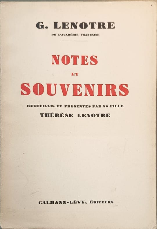 Calmann-Lévy 1940 237 pages in8. 1940. broché. 237 pages. Il s'agit d'un recueil posthume des carnets notes et souvenirs de l'historien et auteur dramatique français G. Lenotre (Théodore Gosselin) spécialiste de la Révolution française compilé et présenté par sa fille Thérèse Lenotre