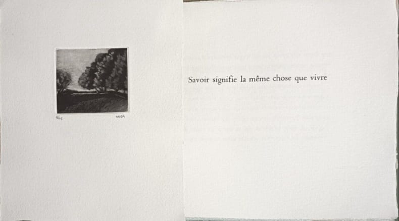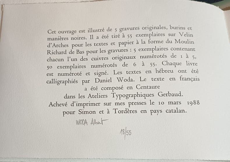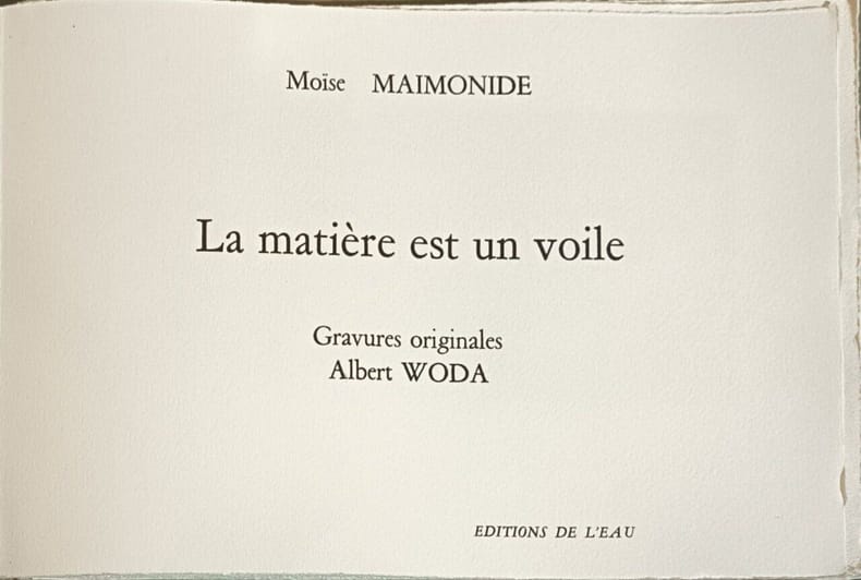 EDITIONS DE L'EAU 1988 non paginé pages in4 oblong. 1988. en feuilles sous boitier d'origine. non paginé pages. Il s'agit d'une édition d'art de luxe et limitée (55 exemplaires) d'un texte de Moïse Maïmonide présentant le texte hébreu calligraphié en regard de sa traduction française et illustré de cinq gravures originales (burins et manières noires) par Albert Woda