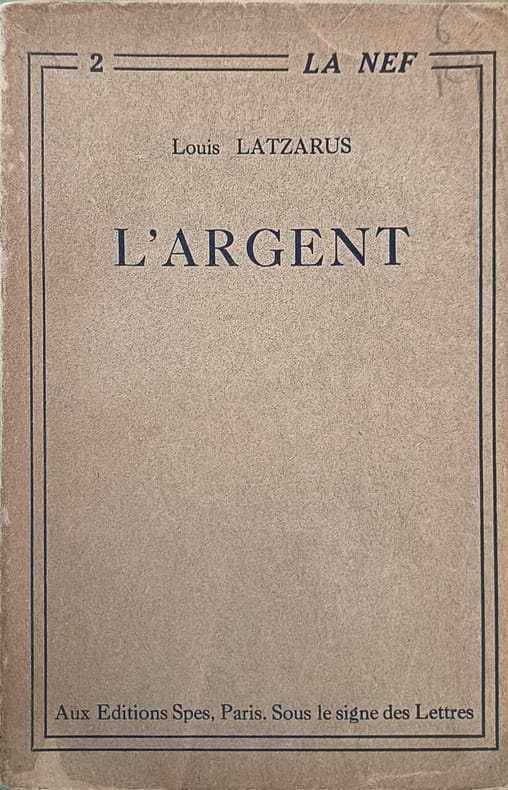 Aux Editions Spes Paris. Sous le signe des Lettres 1927 229 pages in8. 1927. broché. 229 pages. Cet ouvrage de Louis Latzarus publié en 1927 va au-delà d'une simple histoire de l'argent en France durant la période contemporaine. Il explore en profondeur l'histoire des relations complexes que les Français entretiennent avec l'argent analysant ses dimensions sociales et culturelles