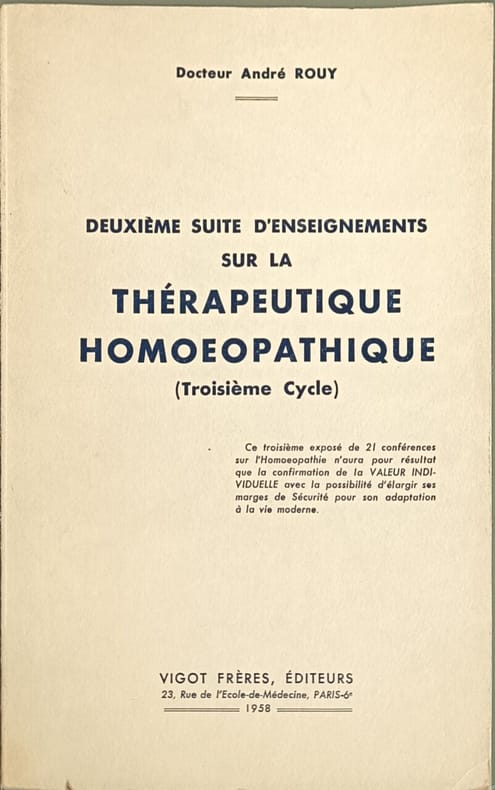 Vigot Frères Éditeurs 1958 180 pages in8. 1958. broché. 180 pages. Cet ouvrage constitue la suite des enseignements du Dr André Rouy sur la thérapeutique homéopathique présentée comme un "second cycle". Il rassemble la synthèse de ses conceptions basées sur une longue pratique sous la forme d'un exposé de 21 conférences destinées à l'enseignement de l'homéopathie