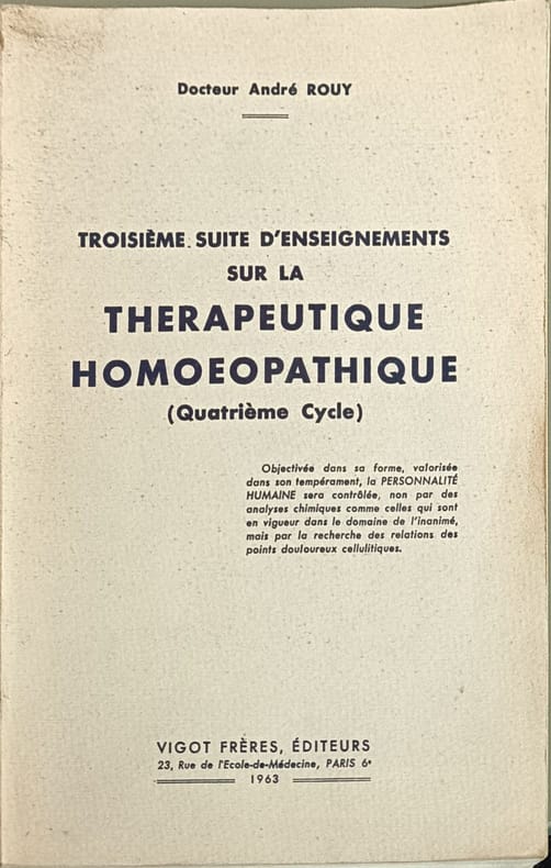 Vigot Frères Editeurs 1963 175 pages in8. 1963. broché. 175 pages. Ce livre constitue le troisième cycle d'une série d'enseignements sur la thérapeutique homéopathique rédigée par le Docteur André Rouy directeur de la Revue française d'homéopathie. Il synthétise ses conceptions thérapeutiques basées sur une longue pratique clinique faisant suite à ses premiers ouvrages publiés chez le même éditeur Vigot dans les années 1950