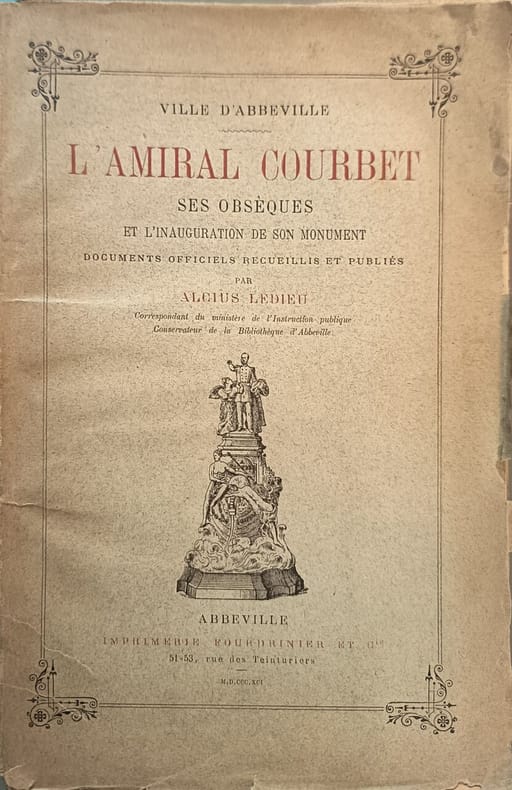 Imprimerie Fourdrinier et Cie 1891 101 pages in8. 1891. broché. 101 pages. Ce livre publié à l'origine en 1886 ou 1891 est un recueil de documents officiels concernant l'amiral Courbet compilé et publié par Alcius Ledieu. Il se concentre sur les obsèques de l'amiral et l'inauguration de son monument dans un contexte lié à la ville d'Abbeville