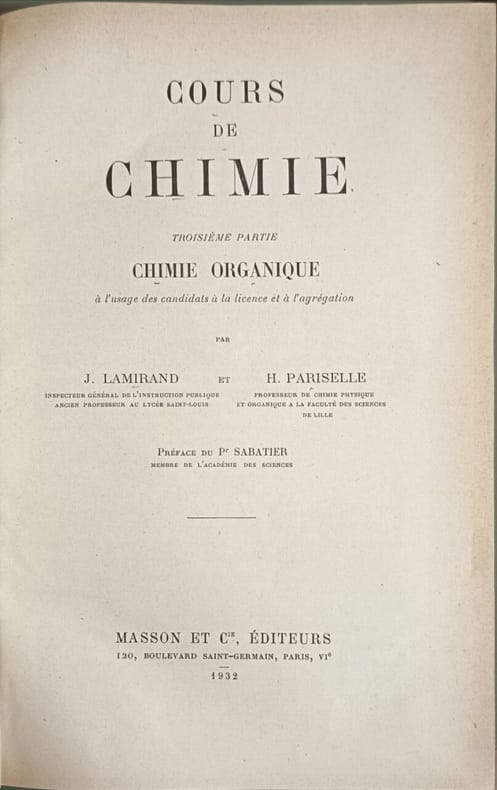 Masson et Cie Éditeurs 1932 746 pages in8. 1932. reliure editeur. 746 pages. Ce livre est le troisième tome d'un cours de chimie complet spécifiquement consacré à la chimie organique. Il est conçu à l'usage des candidats préparant la licence et l'agrégation en chimie. L'ouvrage publié par Masson bénéficie d'une préface du professeur Paul Sabatier membre de l'Académie des sciences
