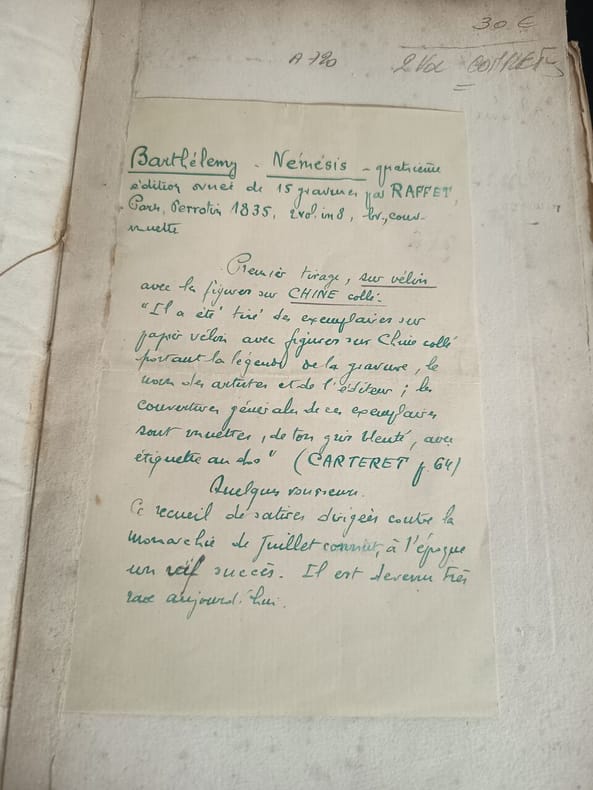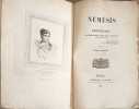 Perrotin éditeur 1835 381/346 pages in8. 1835. broché. 381/346 pages. Némésis est une série de satires hebdomadaires en vers publiées entre 1831 et 1832 par Auguste Marseille Barthélemy souvent avec la collaboration de Méry. L'œuvre attaque violemment le gouvernement et les ministres du roi Louis-Philippe mêlant engagement politique et art littéraire. Elle a connu plusieurs éditions notamment chez Perrotin en 1835 ornées d'illustrations d'Auguste Raffet et d'un frontispice de Tony Johannot