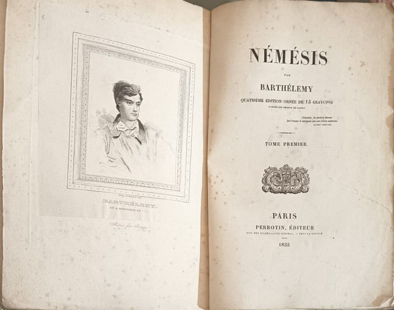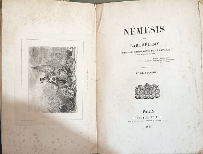 Recueil de satires en vers publiées de mars 1831 à avril 1832 dans l'hebdomadaire “La Némésis”, où Auguste Barthélémy (1794-1867) attaquait le gouvernement et les ministres de Louis-Philippe. Bon état d’occasion