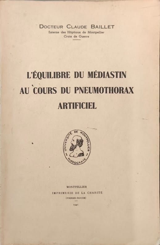 Imprimerie de la Charité 1941 107 pages in8. 1941. broché. 107 pages. Ce livre écrit par le Dr Claude Baillet est un travail original portant sur l'étude du balancement ou de l'équilibre du médiastin pendant la pratique du pneumothorax artificiel un traitement historique de la tuberculose